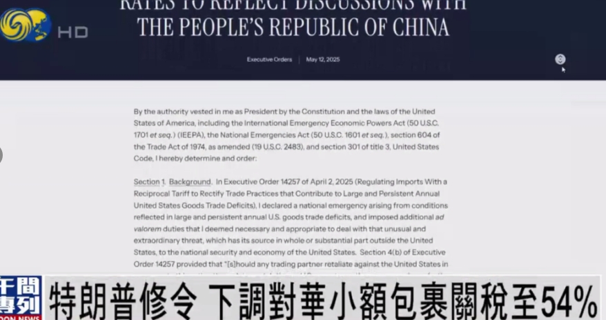 5月13日,美國白宮官網(wǎng)發(fā)布行政命令,修正價值低于800美元小額包裹的從價關(guān)稅稅率,從120%降低到54%。