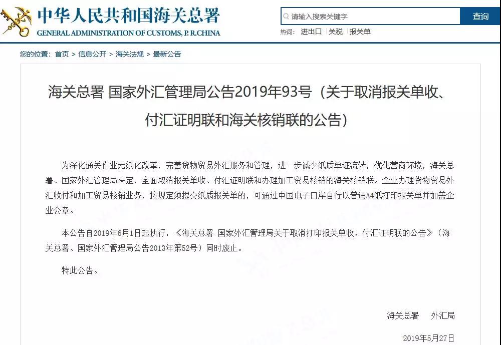 海關(guān)宣布:6月1日起取消報(bào)關(guān)單收、付匯證明聯(lián)和海關(guān)核銷聯(lián)!