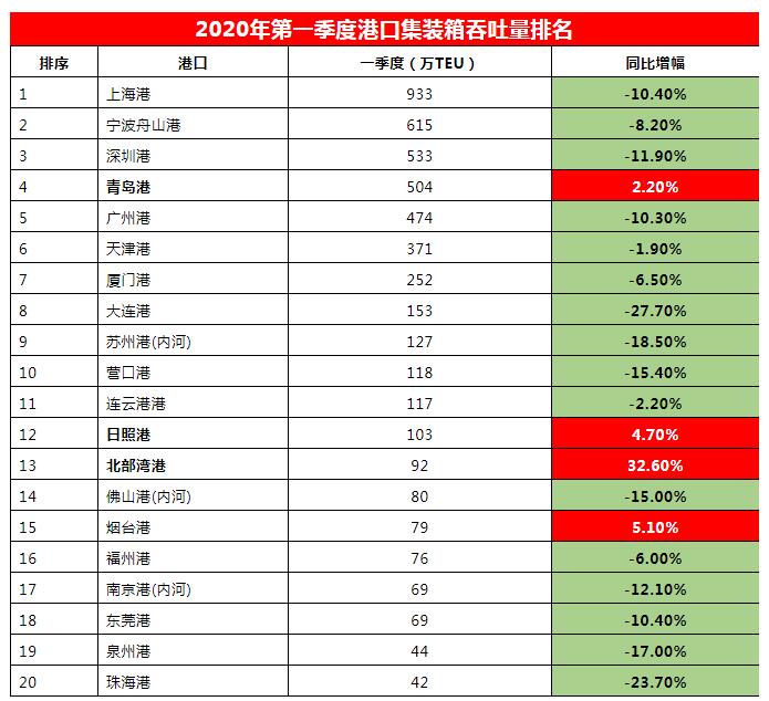 由于受新冠疫情的影響,貨物和集裝箱吞吐量均受不同程度影響。集裝箱吞吐量排名前十的港口,只有青島港達(dá)到同比2.2%增幅,完成504萬(wàn)TEU箱量;其他港口出現(xiàn)不同程度下滑,多數(shù)港口達(dá)兩位數(shù)跌幅,大連港跌幅更是達(dá)到27.7%。值得一提的是,排名第13的北部灣港則出現(xiàn)了高達(dá)32.6%的增幅。全國(guó)港口集裝箱吞吐量前20排名如下表: