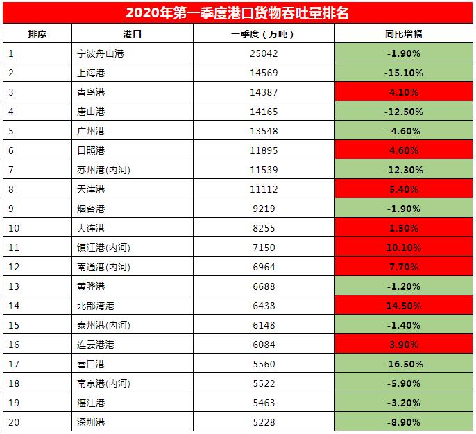 全國(guó)各大港口貨物、集裝箱吞吐量排名出爐(2020年第一季度)