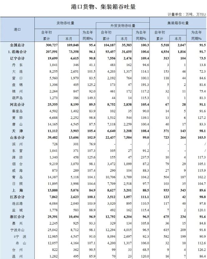 貨物吞吐量方面,排名前十的港口只有環(huán)渤海灣的青島、天津、大連和日照港有一定的同比增長(zhǎng),其他港口均有不同程度的跌幅;貨物吞吐量排名第一的寧波舟山港出現(xiàn)1.9%的跌幅,上海港跌幅達(dá)15.1%。山東港口集團(tuán)的青島和日照港在貨物吞吐量和集裝箱吞吐量完成雙殺,紛紛逆勢(shì)上揚(yáng)。全國(guó)港口貨物吞吐量前20排名如下表: