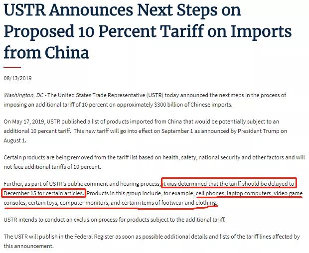美國(guó)當(dāng)?shù)貢r(shí)間8月13日,美國(guó)貿(mào)易代表辦公室(USTR)宣布了對(duì)大約3000億美元的中國(guó)進(jìn)口商品加征10%關(guān)稅的下一步計(jì)劃。基于國(guó)民健康、國(guó)家安全等因素,某些產(chǎn)品將被從關(guān)稅清單中移除,不會(huì)面臨10%的額外關(guān)稅。作為美國(guó)貿(mào)易代表辦公室公開(kāi)評(píng)論和聽(tīng)證程序的一部分,決定將某些商品的關(guān)稅推遲至12月15日。這類產(chǎn)品包括手機(jī)、筆記本電腦、視頻游戲機(jī)、某些玩具、電腦顯示器以及某些鞋類和服裝。根據(jù)3000億加稅清單估算,暫緩商品規(guī)模約占3000億清單商品的比例為59%。其余產(chǎn)品仍從9月1日起加征關(guān)稅?!?/span>