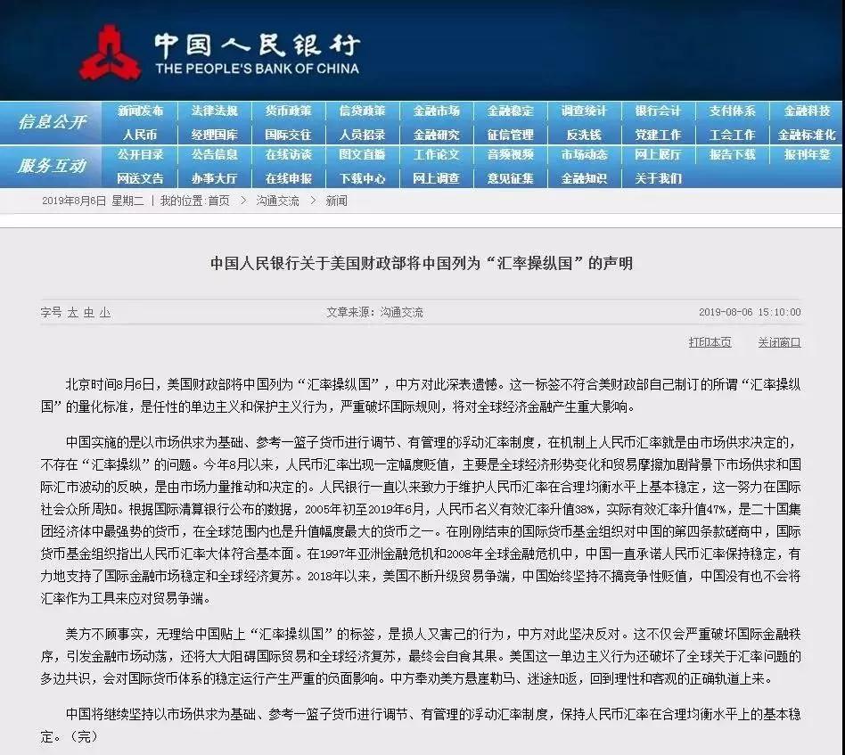 北京時間8月6日,美國財政部將中國列為“匯率操縱國”,中方對此深表遺憾。這一標簽不符合美財政部自己制訂的所謂“匯率操縱國”的量化標準,是任性的單邊主義和保護主義行為,嚴重破壞國際規(guī)則,將對全球經濟金融產生重大影響。