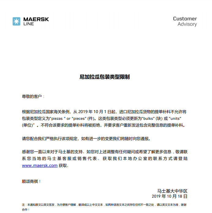根據(jù)尼加拉瓜國家海關(guān)條例,從2019年10月1日起,進口尼加拉瓜貨物的提單補料不允許將包裝類型定義為“piezas " or "pieces” (件)。這類包裝類型必須更新為“bulks” (塊) 或 “units”(單位)”。不符合該要求的提單補料將被拒絕,并要求客戶重新發(fā)送包含完整信息的提單補料。