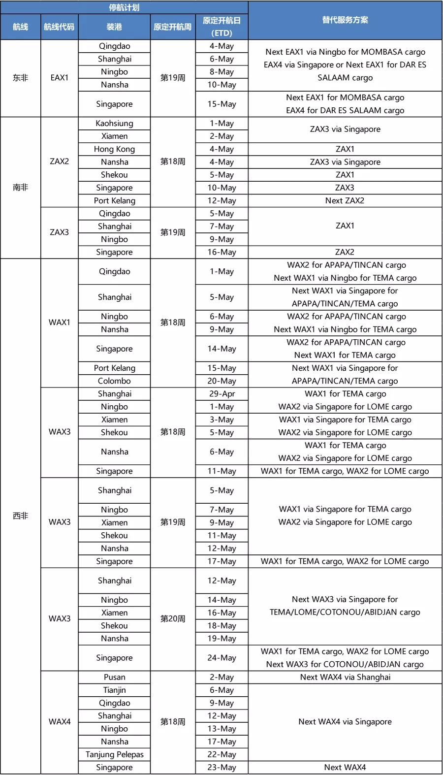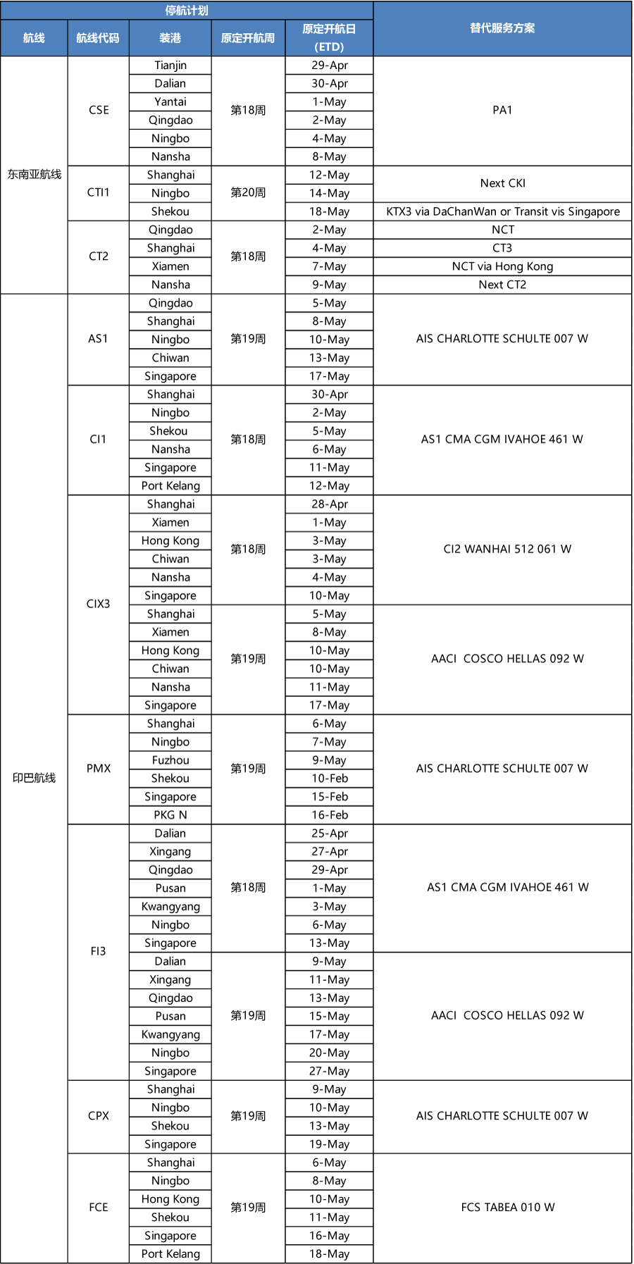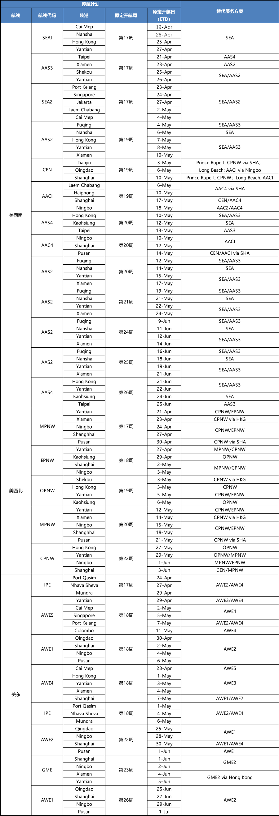 部分船公司公布了最新的一份各大航線調(diào)整及服務(wù)替代方案,也就是業(yè)界俗稱的停航跳港計(jì)劃表,我們發(fā)現(xiàn)雖然現(xiàn)在才四月份,但部分7月份的停航跳港計(jì)劃安排已經(jīng)出爐了!而船公司還特別提示, 停航跳港的安排可能根據(jù)實(shí)際情況進(jìn)一步調(diào)整!