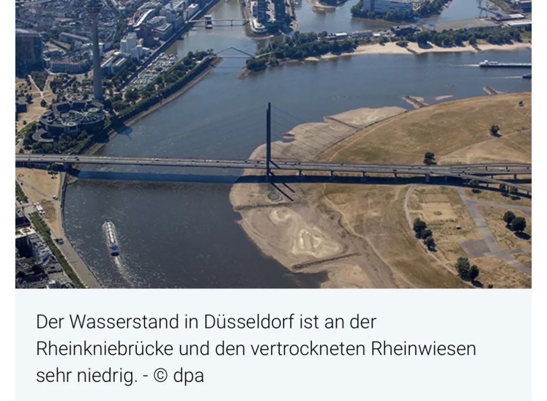 萊茵河下游的局勢(shì)也不樂(lè)觀。周日下午,科隆的水位只有74厘米,比前一天降低了8厘米。在杜塞爾多夫,萊茵河水位已經(jīng)下降到了34 厘米,24小時(shí)內(nèi)下降了9厘米。不過(guò),航道實(shí)際深度仍有近兩米的水深。