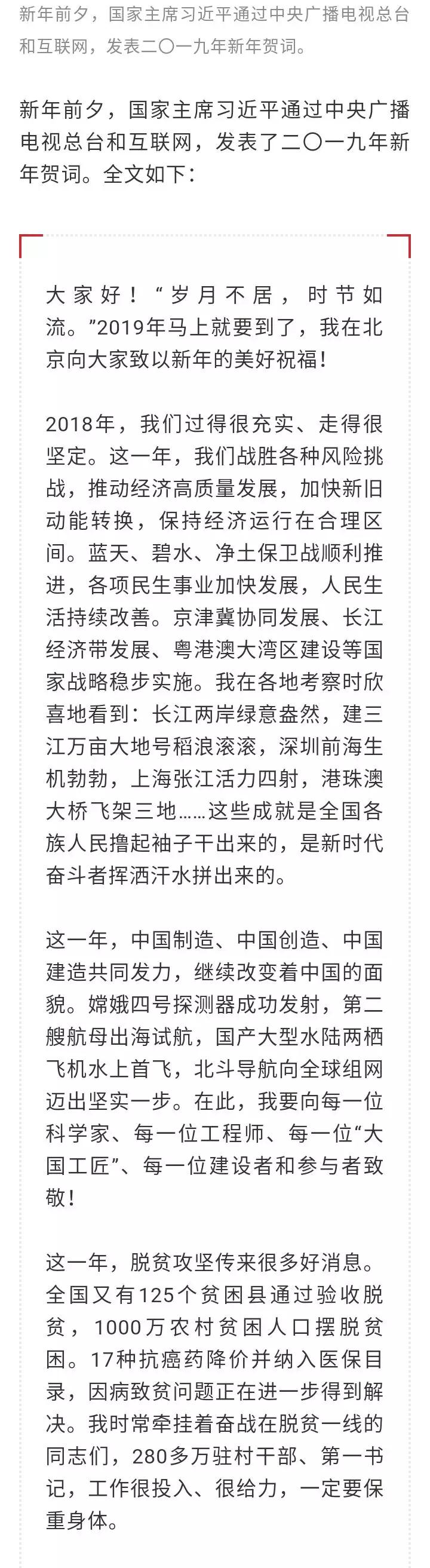習(xí)近平發(fā)表二〇一九年新年賀詞:我們都在努力奔跑,我們都是追夢人