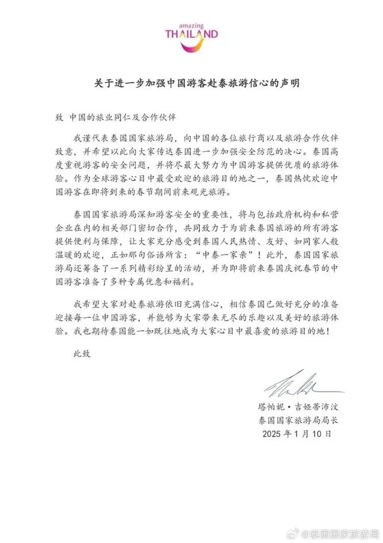 泰國(guó)國(guó)家旅游局11日在微博上發(fā)表《關(guān)于進(jìn)一步加強(qiáng)中國(guó)游客赴泰旅游信心的聲明》。