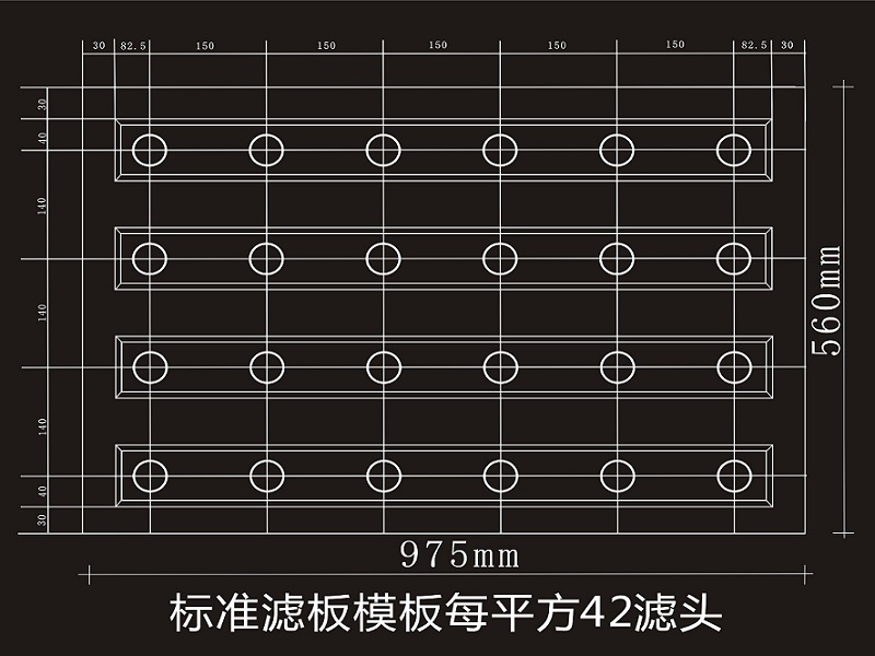 (B型整體濾板模板選型:縱向間距150mm,橫向間距140mm,相當(dāng)于42個(gè)濾頭/㎡)
