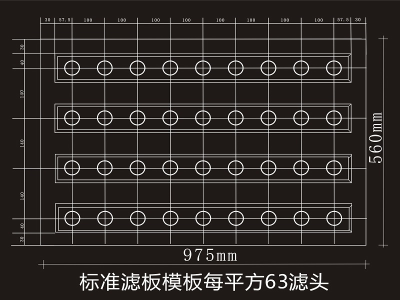 (B型整體濾板模板選型:縱向間距100mm,橫向間距140mm,63個(gè)濾頭/㎡)